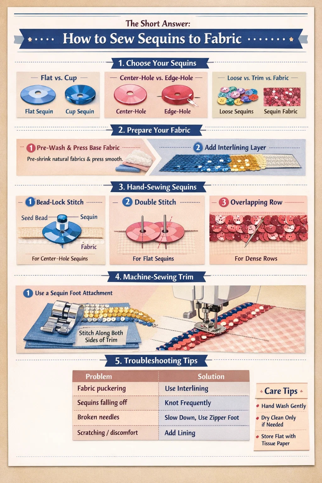 Menjahit payet ke kain memerlukan metode jahitan tangan menggunakan jarum dan benang manik-manik, atau metode mesin menggunakan sambungan kaki payet. Satu-satunya langkah persiapan yang paling penting adalah menambahkan lapisan interlining antara payet dan kain dasar — ini mencegah kerutan, mendistribusikan ketegangan, dan melindungi kain ringan agar tidak terkoyak oleh beratnya elemen dekoratif seiring waktu. Baik Anda menghiasi kostum, gaun malam, atau tekstil rumah, teknik intinya melibatkan pengikatan setiap payet (atau untaian payet) dengan jahitan pengunci sehingga rata dan tetap aman meskipun dipakai dan dicuci berulang kali.