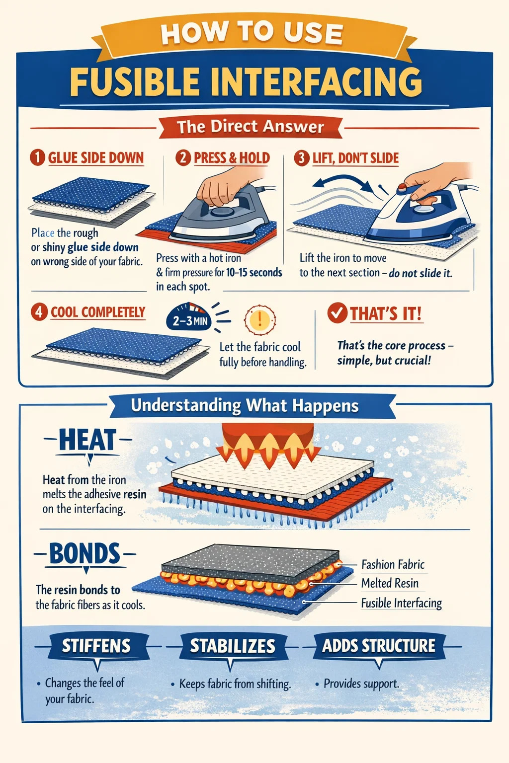 Ikatan antarmuka yang dapat melebur ke kain menggunakan panas dari setrika. Anda menempatkan sisi lem (sisi yang kasar atau sedikit mengkilat) menghadap ke bawah pada sisi kain yang salah , lalu tekan dengan setrika panas menggunakan tekanan yang kuat dan berkelanjutan selama 10–15 detik per bagian. Angkat dan pindahkan setrika — jangan digeser. Biarkan kain benar-benar dingin sebelum ditangani. Itulah proses intinya. Segala hal lainnya — memilih jenis yang tepat, menyiapkan kain, mengatasi masalah pengelupasan — dibangun di atas fondasi ini.