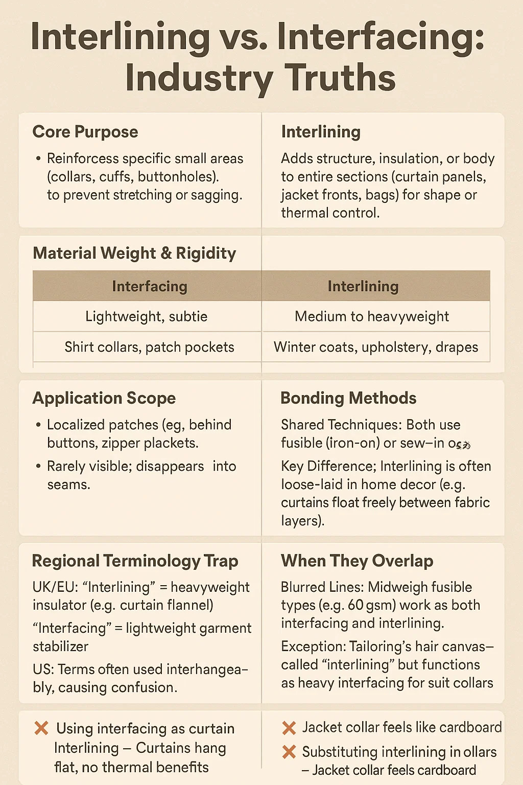 UK/EU: "Interlining" = isolator kelas berat (misalnya, kain flanel tirai). "Interfacing" = penstabil garmen yang ringan.