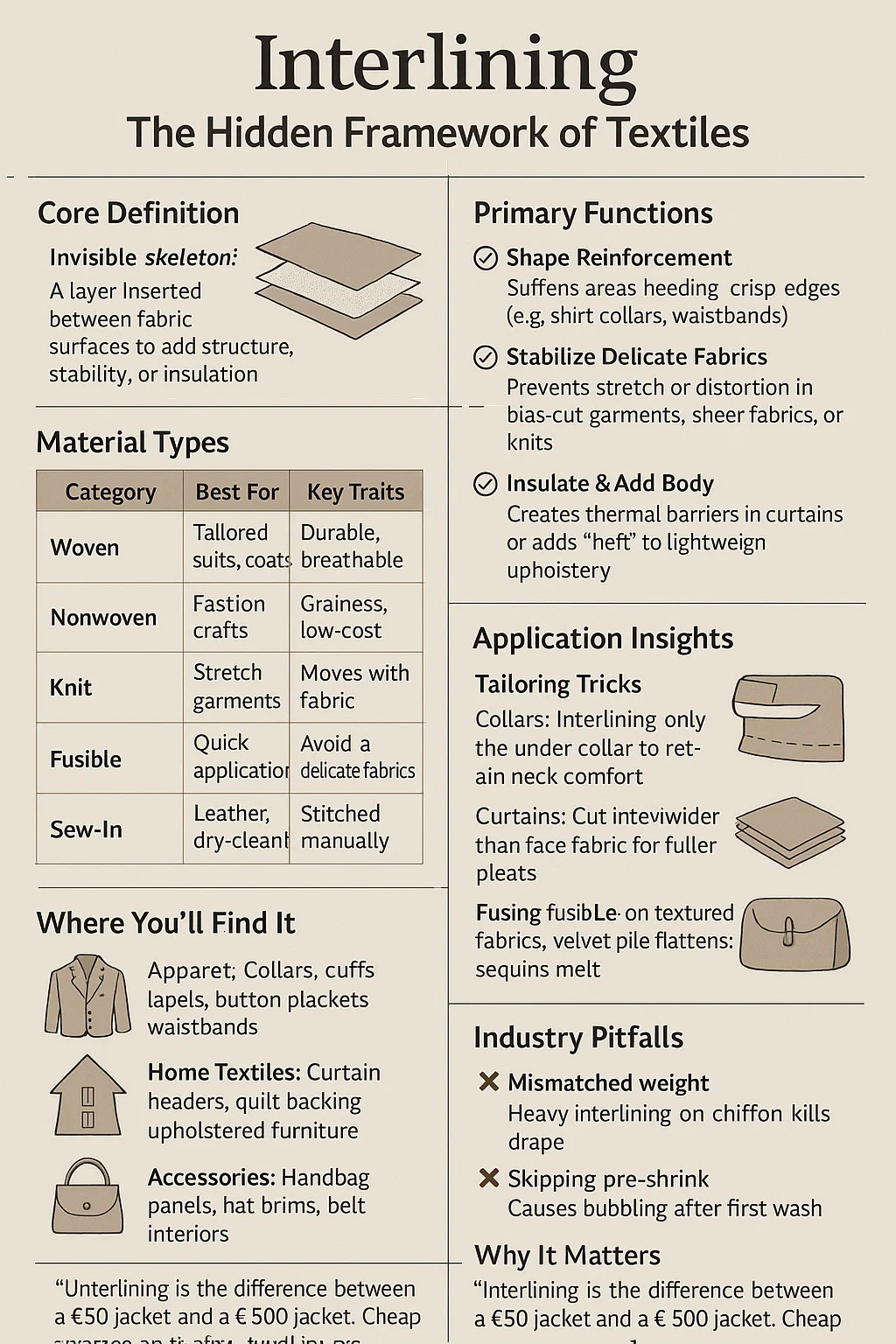 "Skeleton Tak Terlihat": Lapisan yang dimasukkan di antara permukaan kain untuk menambah struktur, stabilitas, atau isolasi.