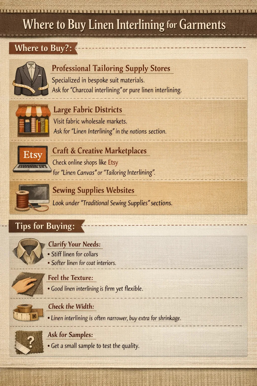 Jika Anda ingin membeli linen interlining atau antarmuka untuk pembuatan garmen, ada beberapa sumber terpercaya yang bisa Anda jelajahi. Karena linen adalah bahan yang relatif mewah yang digunakan dalam setelan jas pesanan dan pakaian siap pakai berkualitas tinggi, Anda perlu mencarinya di toko kain khusus.