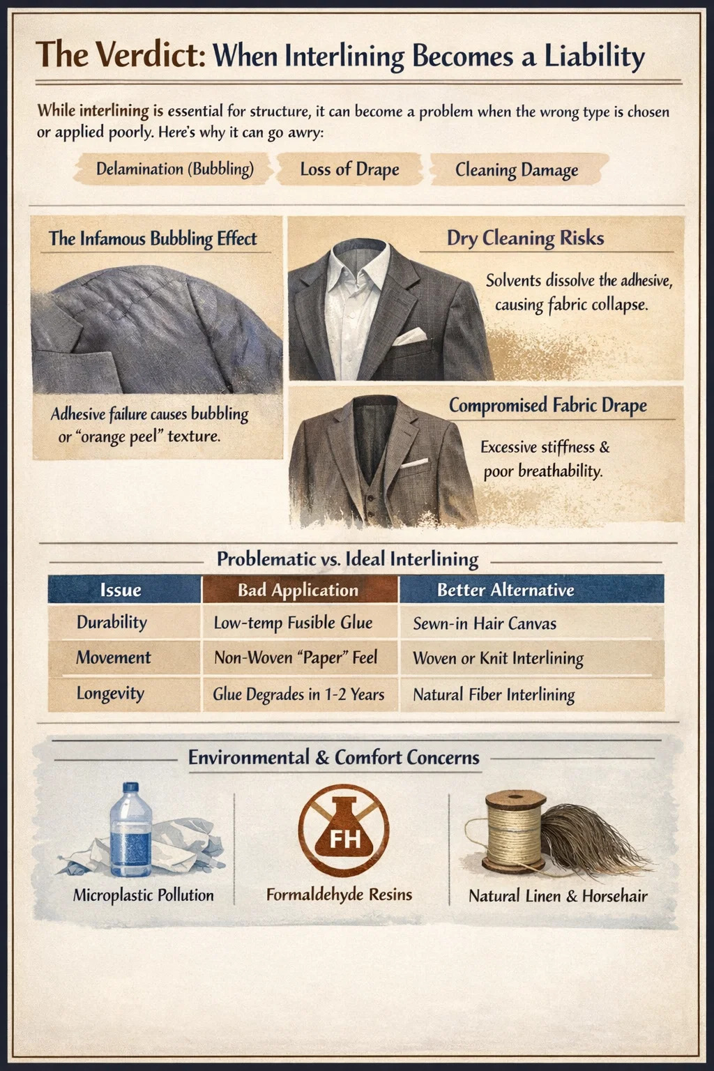 Untuk lebih jelasnya, interlining pada dasarnya tidak buruk ; sebenarnya, ini penting untuk struktur. Namun, menjadi "buruk" jika jenis yang dipilih salah atau penerapannya buruk. Alasan utama mengapa lapisan interlining tertentu dianggap merugikan suatu pakaian adalah delaminasi (menggelembung) , sebuah hilangnya tirai alami , sebuahnd reaksi buruk terhadap pembersihan . Jika ikatan antara lapisan interlining dan kain bagian depan gagal, maka akan terjadi kerusakan estetika permanen yang tidak dapat diperbaiki.
